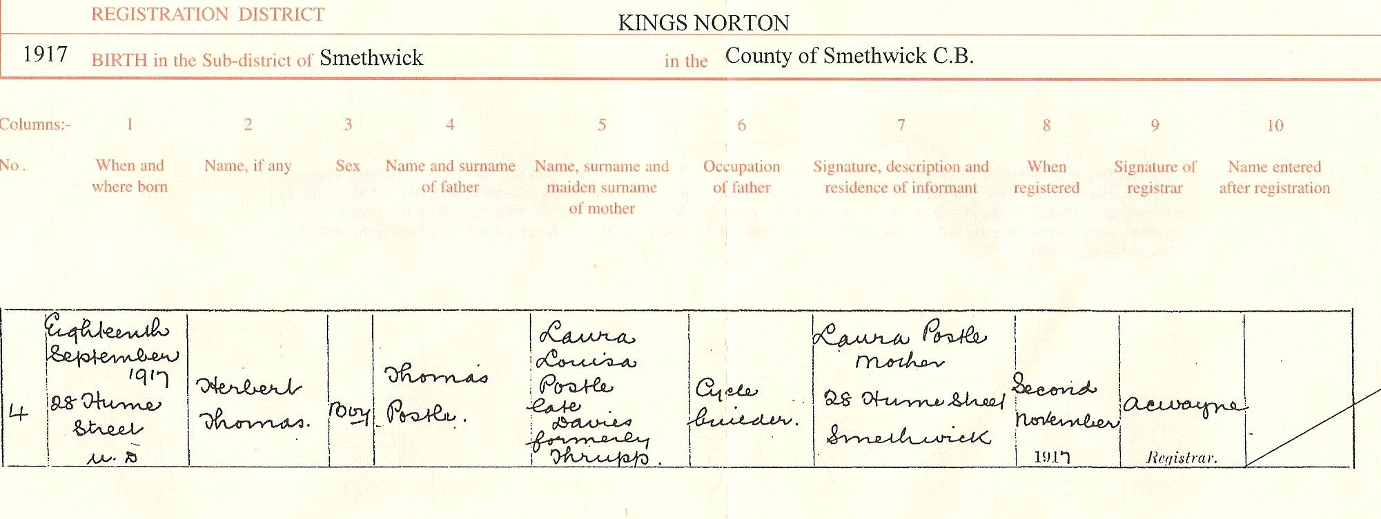 Birth Certificate for Herbert Thomas Postle