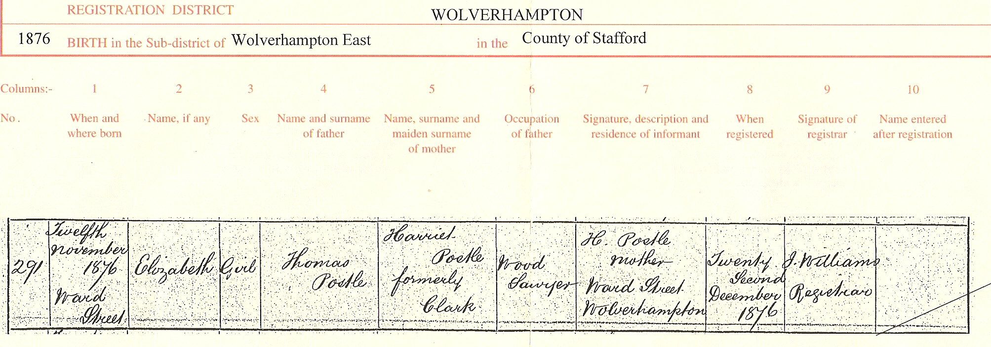 Birth Certificate for Elizabeth Postle